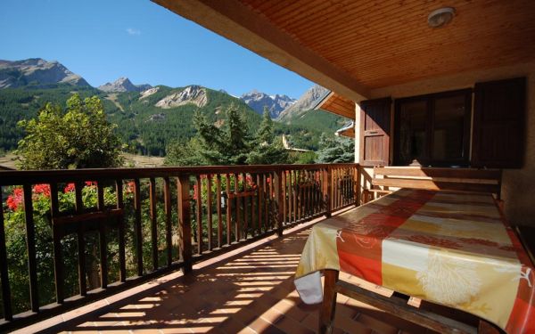 Terrasse avec vue sur la vallée et sur le domaine skiable.